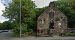 Entry is by the lower side door on the left-hand side of the building as you look at it.